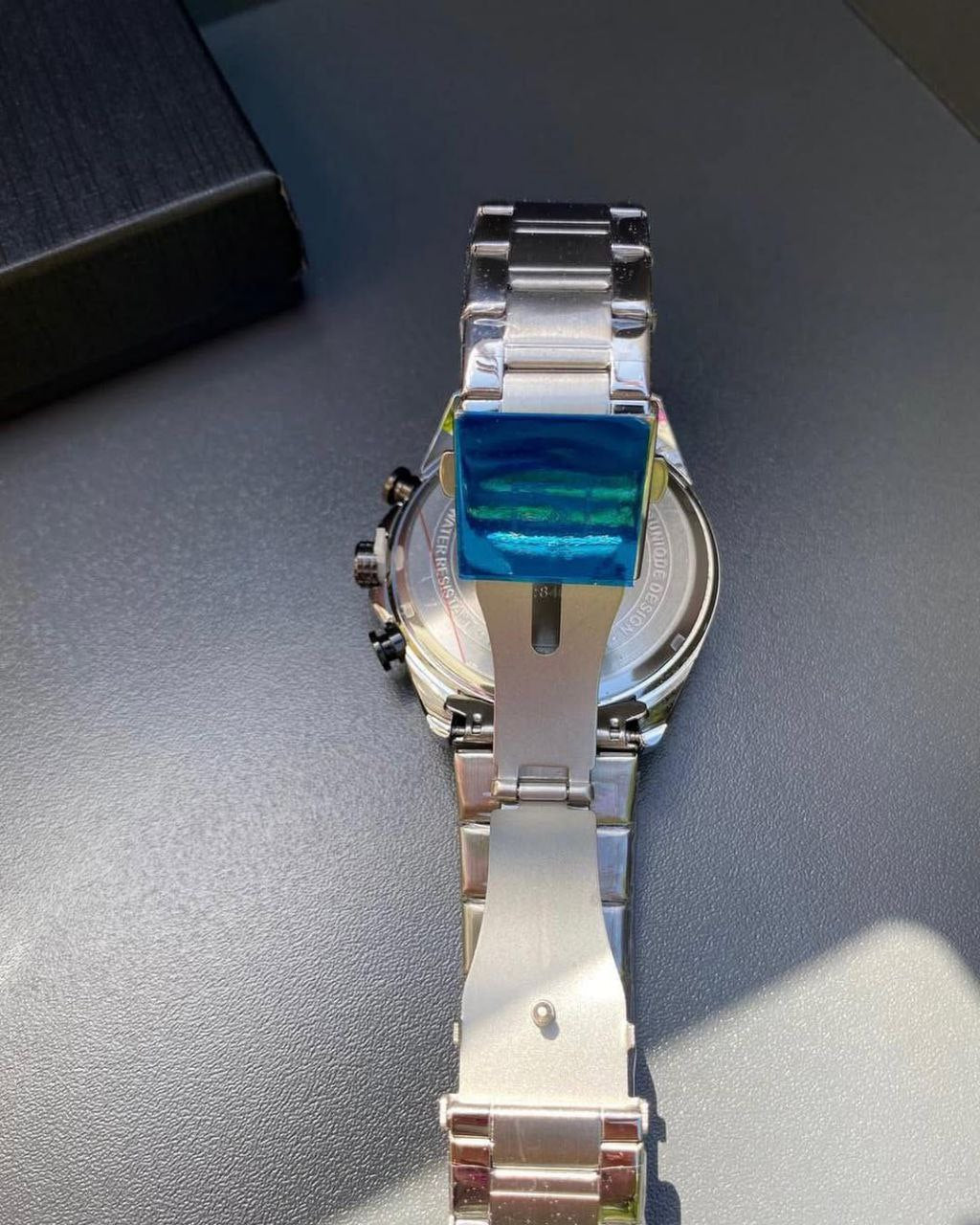 بهيكل معدني مصقول بعناية وقرص واسع بقطر سبعةٍ وأربعين مليمترًا، تفرض الساعة حضورها بثقة وأناقة لا تخطئها العين. يحيط بها سوار فولاذي متين بطول ثلاثةٍ وعشرين سنتيمترًا وعرض أربعةٍ وعشرين مليمترًا، صُمّم ليمنحك راحة في الارتداء وثباتًا يُليق برجل يعرف معنى التميّز.