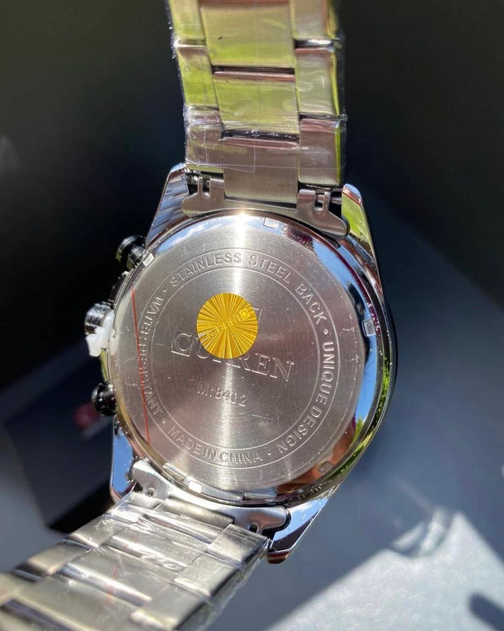 تنبض كورين 8402 بدقّة حركة كوارتز عالية الأداء تضمن ثبات الزمن وانسيابه بانضباطٍ راقٍ. يتزيّن الميناء بعدّادات كرونوغراف احترافية لقياس الوقت بدقة متناهية، مع نافذة لعرض التاريخ بأسلوب أنيق يكمّل جمال التصميم. أما العقارب والمؤشرات المضيئة فتمنحك وضوحًا تامًا في كل الظروف، ليبقى حضورك متألقًا في كل لحظة.